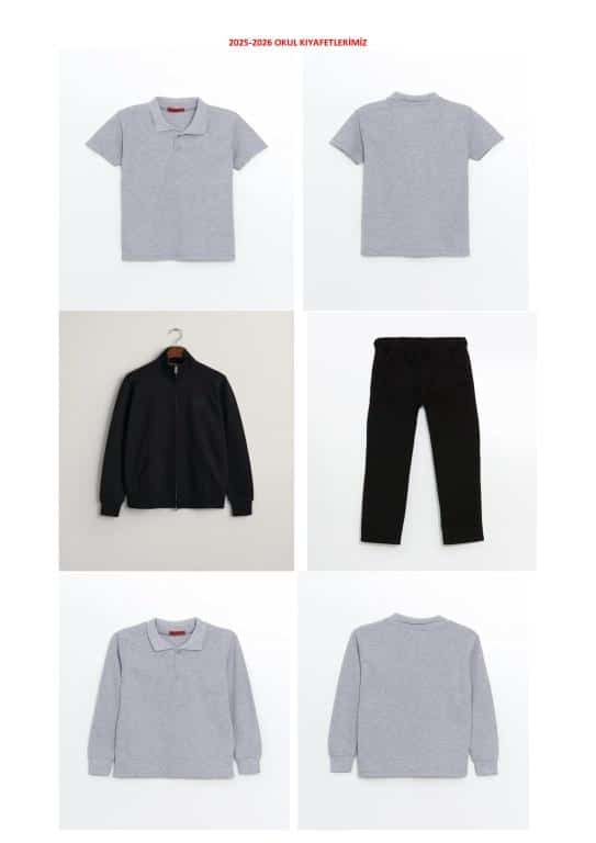 1- Erkek öğrenciler: Siyah pantolon, okul armasını veya ismini taşımayan Gri tshirt (kısa-uzun kol) , Siyah Fermuarlı sweatshirt.